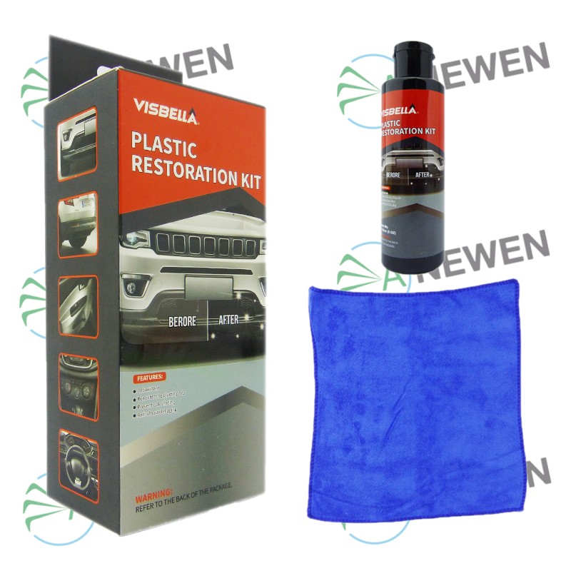Kit de Renovación y mantención, marca Visbella, ideal para renovar los plásticos exteriores de tu vehículo, incluye paño de microfibra. Contenido 150 ml